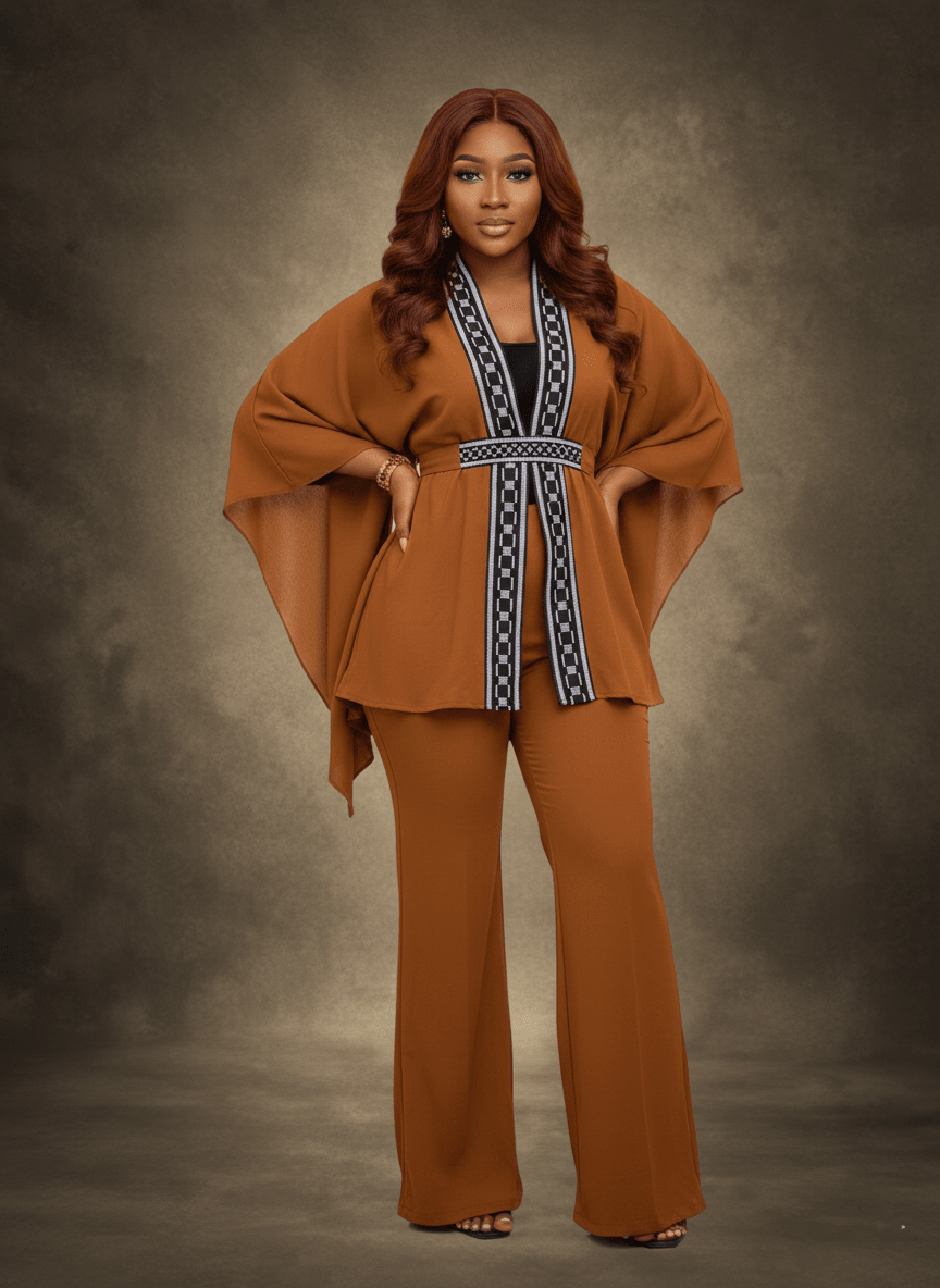 L'ensemble Aube Ocre incarne l'élégance contemporaine et l'héritage raffiné d'Ibag Couture. Conçu dans un crêpe fluide d'un brun-orangé envoûtant, il promet une silhouette aérienne et une liberté de mouvement inégalée, véritable ode à la femme moderne qui embrasse son style avec assurance. La tunique, s'inspirant de la grâce intemporelle du kimono, offre une coupe ample et structurée, agrémentée de bandes décoratives méticuleusement appliquées sur le devant et la ceinture. Ces motifs géométriques, mariant avec subtilité le noir et le blanc, sont le fruit d'un savoir-faire artisanal exceptionnel et de notre passion pour l'art textile, ajoutant une touche graphique sophistiquée et distincte à l'ensemble. Le pantalon, d'une coupe large et fluide, complète harmonieusement cette tenue avec une aisance naturelle, épousant les mouvements du corps pour un confort absolu sans jamais transiger sur l'élégance. Chaque détail, du choix minutieux du tissu à la précision des finitions, est pensé pour offrir une pièce de prêt-à-porter qui porte l'empreinte de la haute couture sur mesure d'Ibag Couture, célébrant l'individualité et la sophistication.