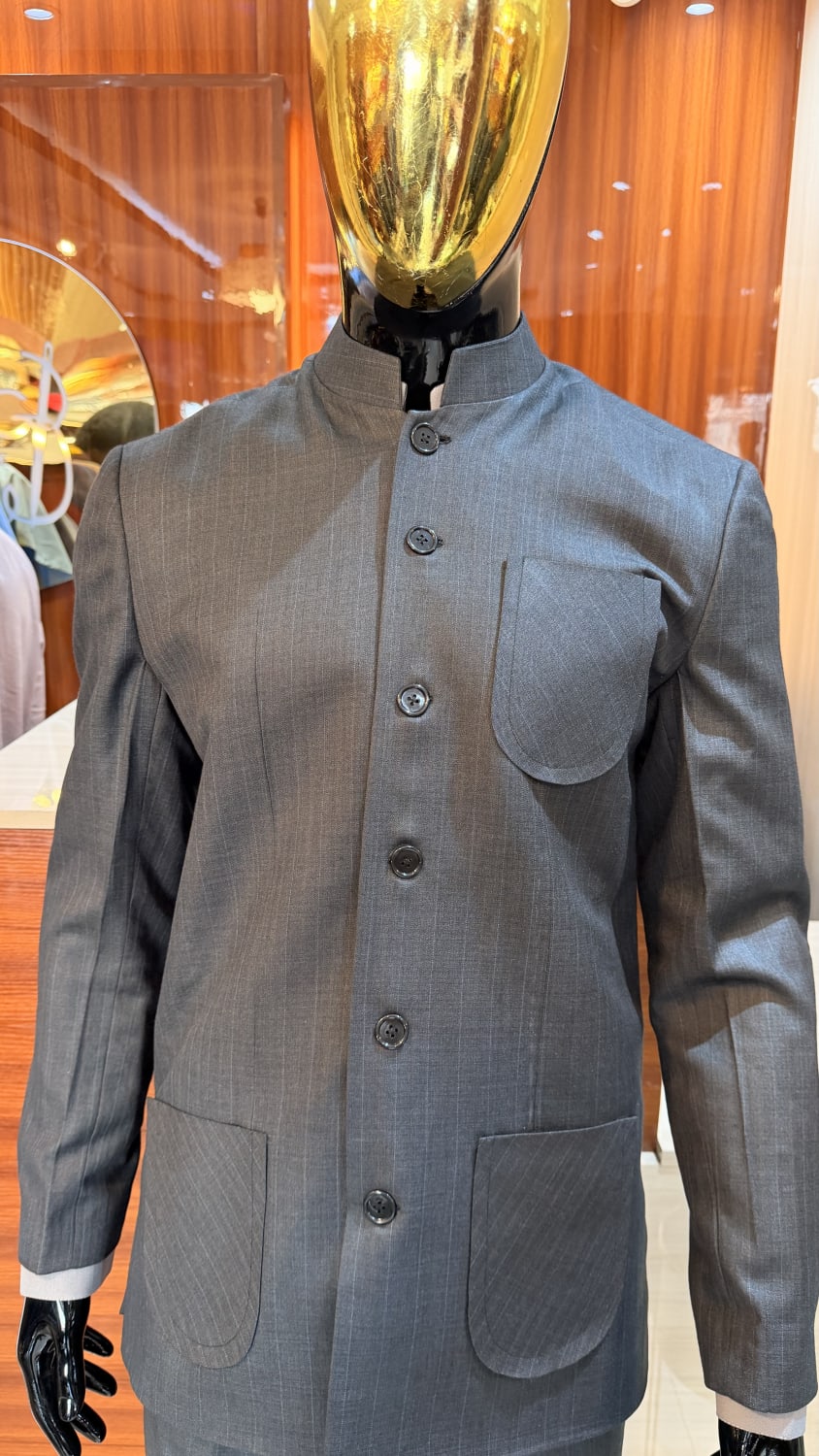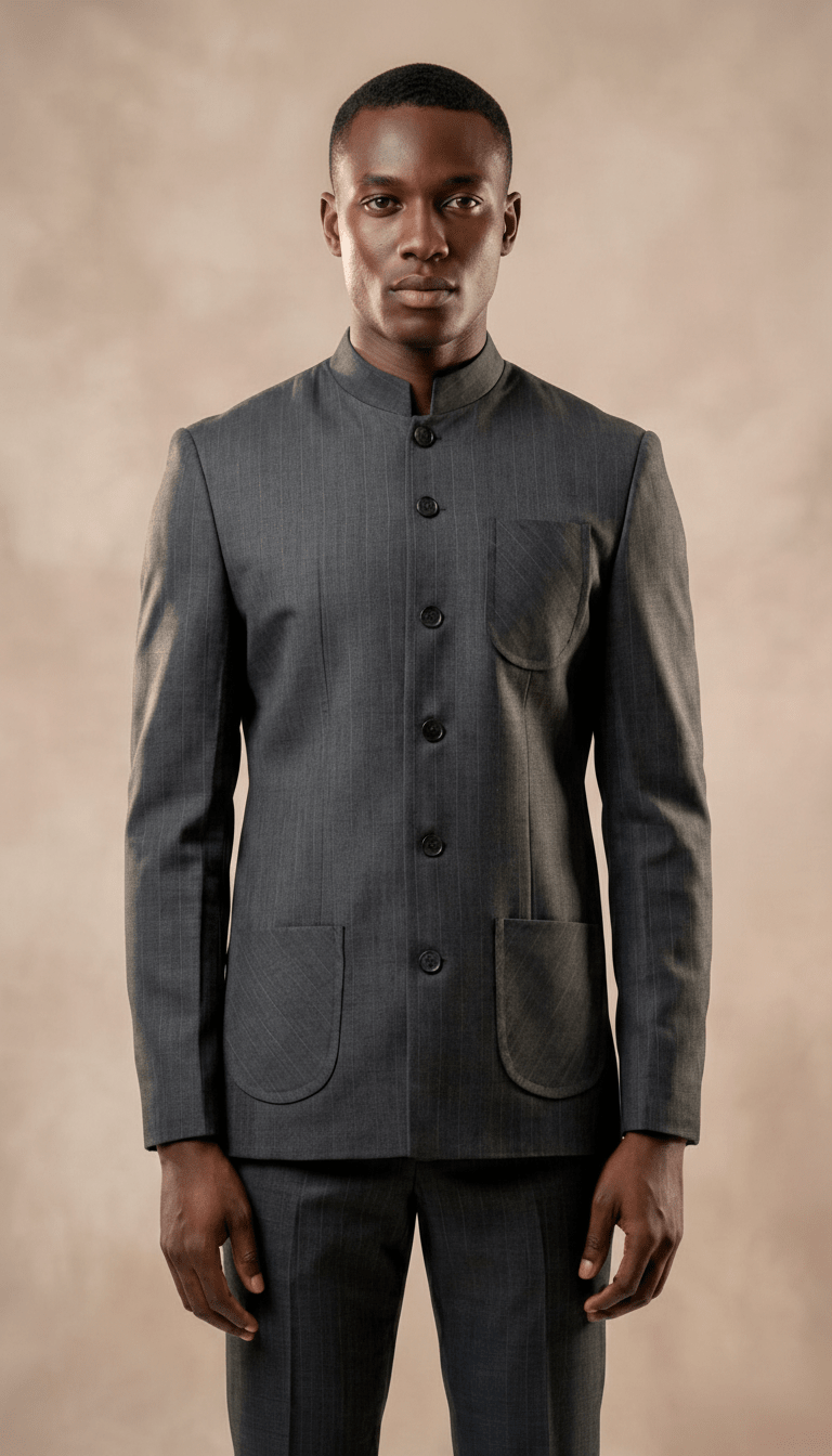 Ibag Couture est fier de présenter 'L'Élégant', un costume masculin prêt-à-porter qui incarne la fusion parfaite entre tradition artisanale africaine et élégance contemporaine. Conçu pour l'homme moderne qui valorise l'exclusivité et le confort, ce costume est confectionné dans une laine fine d'une qualité exceptionnelle, garantissant un tombé impeccable et une sensation agréable sur la peau, essentielle pour l'élégance du quotidien comme pour les occasions les plus formelles. La sophistication de ce modèle réside dans ses détails distinctifs, fruits d'un savoir-faire méticuleux. Sa veste, d'un gris anthracite profond et intemporel, est audacieusement rehaussée d'un col mao qui modernise la silhouette classique, offrant une allure à la fois raffinée et avant-gardiste. La boutonnière centrale à six boutons, méticuleusement travaillée, et les trois poches plaquées aux bords délicatement arrondis témoignent de l'attention particulière portée aux finitions dans nos ateliers. Le tissu, orné de fines rayures verticales pour une prestance élancée, est subtilement contrasté par un motif de rayures diagonales exclusif sur les poches, une signature visuelle qui souligne l'originalité et l'expertise artisanale d'Ibag Couture. Chaque pièce est une célébration de l'art du textile et de la couture. 'L'Élégant' est le fruit d'une confection rigoureuse, où chaque couture et chaque pli sont exécutés avec une précision d'orfèvre. Il offre non seulement une esthétique impeccable mais aussi une liberté de mouvement et un ajustement qui valorisent la stature masculine. Ce costume est une invitation à affirmer son style avec assurance, un investissement dans un vêtement intemporel, symbole de l'excellence de la mode africaine haut de gamme, pensée pour le gentleman exigeant.