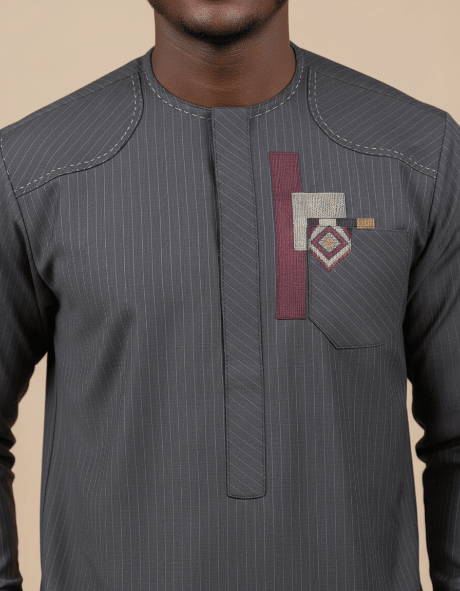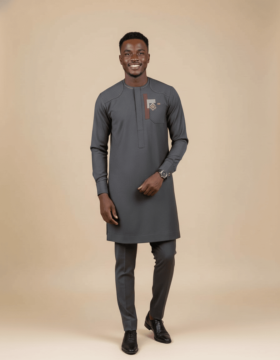 Ibag Couture présente "L'Affirmation Urbaine Anthracite", un ensemble masculin prêt-à-porter qui incarne la quintessence du style moderne et du confort raffiné. Conçu pour l'homme contemporain qui valorise une élégance discrète et un savoir-faire inégalé, cette pièce est une célébration de notre engagement envers l'artisanat textile d'exception. Réalisé dans un coton de qualité supérieure, il se distingue par un motif pinstripe subtil et une profonde teinte gris anthracite, conférant une allure sophistiquée et polyvalente. La tunique, pièce maîtresse de cet ensemble, est magnifiée par des surpiqûres décoratives minutieuses sur la poitrine, témoignant de la précision de nos ateliers. Une poche plaquée unique, ornée d'un motif géométrique multicolore dans des nuances harmonieuses de marron, gris et beige, ajoute une touche distinctive et une signature artistique. Bien que prêt-à-porter, chaque détail de cet ensemble a été pensé et exécuté avec la méticulosité habituellement réservée au sur-mesure. Il offre une coupe impeccable et un confort absolu, idéal pour les rendez-vous professionnels comme pour les événements décontractés chic. "L'Affirmation Urbaine Anthracite" n'est pas seulement un vêtement, c'est une déclaration de style, un hommage à l'élégance intemporelle africaine et à l'excellence artisanale d'Ibag Couture.