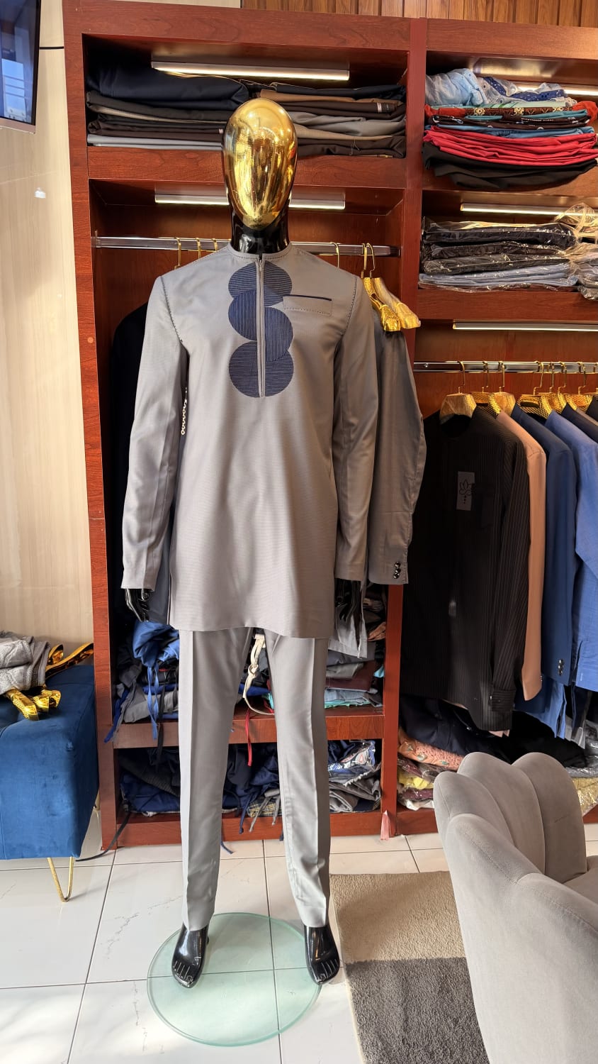 Découvrez l'Ensemble Imara, une création emblématique d'Ibag Couture qui incarne l'alliance parfaite entre l'héritage africain et l'esthétique contemporaine. Conçu pour l'homme moderne et sophistiqué, cet ensemble prêt-à-porter distille une élégance discrète et un confort absolu, fidèle à notre engagement envers le sur-mesure et l'artisanat textile d'exception. La tunique, pièce maîtresse, se distingue par son col mandarin épuré, symbolisant la noblesse et le raffinement. Sa fermeture éclair frontale apporte une touche de modernité fonctionnelle, tandis que la couleur grise dominante lui confère une polyvalence intemporelle. Le véritable art se révèle dans le motif graphique de demi-cercles superposés, d'un bleu marine profond, délicatement apposé sur la poitrine. Ce détail artistique, exécuté avec une précision remarquable, est un témoignage du savoir-faire artisanal minutieux d'Ibag Couture. Une poche passepoilée discrète complète l'ensemble, affirmant une confection soignée où chaque détail compte. Le pantalon assorti, d'une coupe droite impeccable, assure une silhouette fluide et élégante, tout en garantissant une liberté de mouvement optimale. Confectionné à partir d'un coton de qualité ou d'un mélange de tissus sélectionnés pour leur tenue et leur respirabilité, l'Ensemble Imara promet un tombé irréprochable et un confort durable. Ce vêtement, bien que prêt-à-porter, est imprégné de l'esprit du sur-mesure qui guide chacune de nos créations. Il est idéal pour des occasions formelles ou des événements où l'élégance décontractée est de mise, affirmant le style d'un homme qui sait allier tradition et avant-garde.