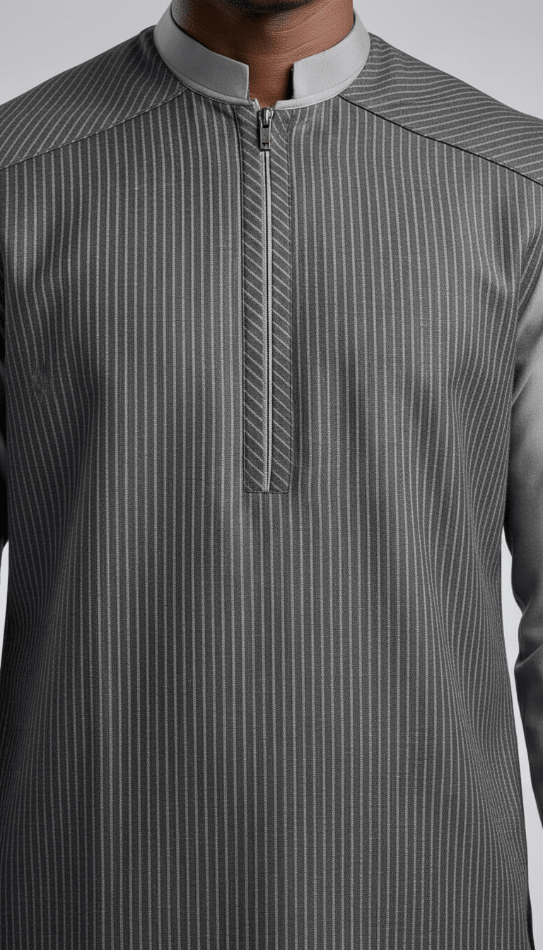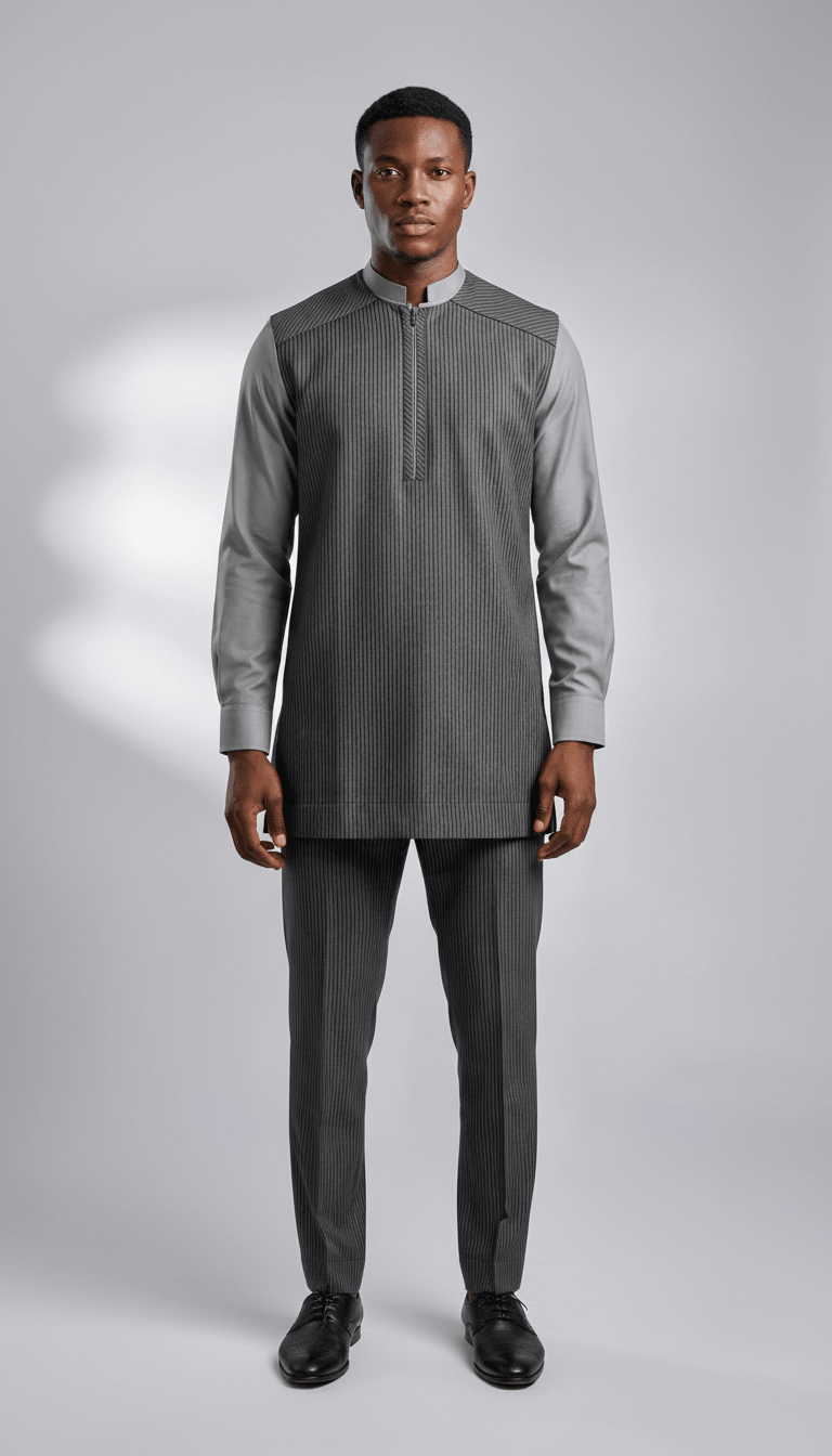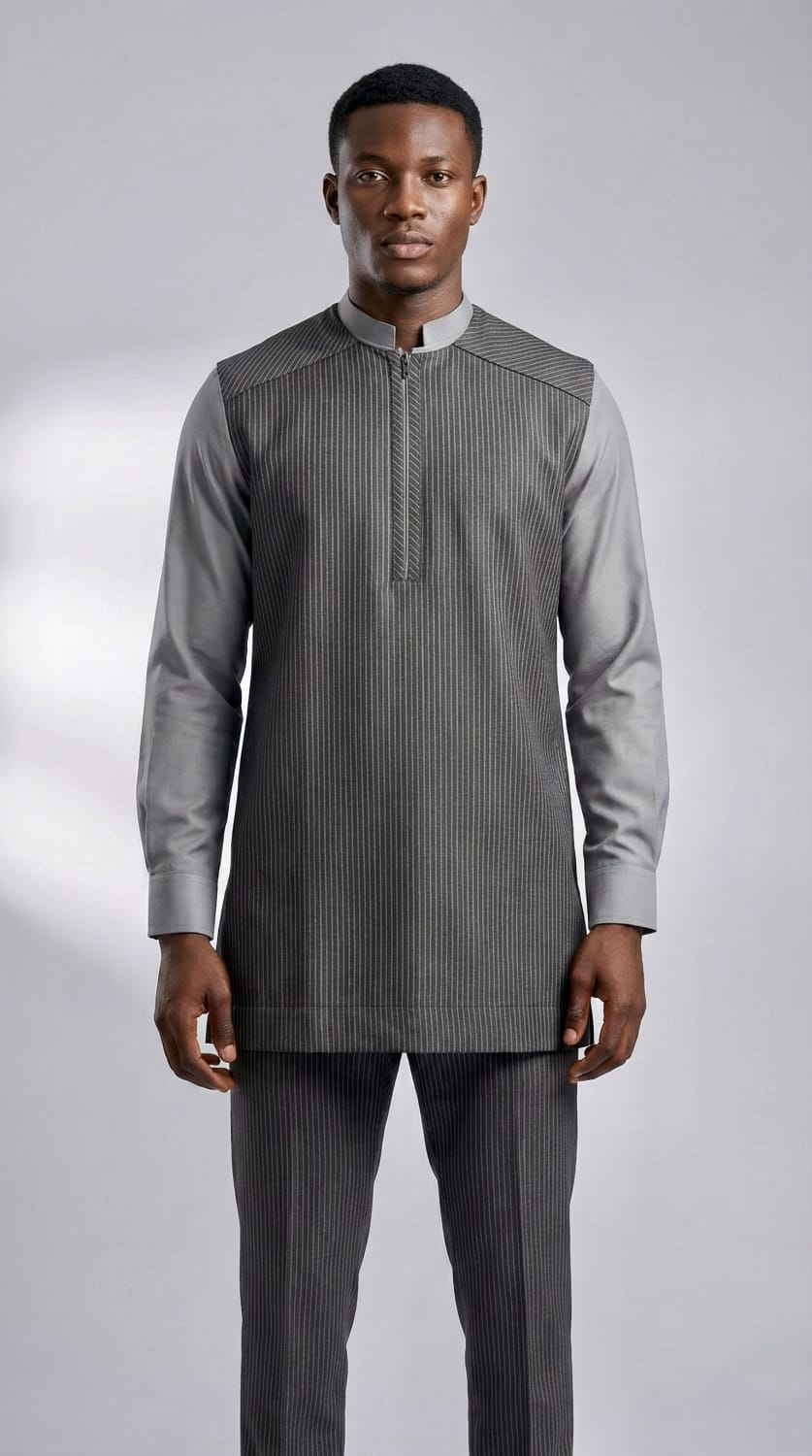 L'ensemble 'Lumière Urbaine' d'Ibag Couture incarne la quintessence de l'élégance masculine contemporaine, fusionnant habilement tradition et modernité. Pensé pour l'homme soucieux de son allure, cet ensemble prêt-à-porter est une ode à notre savoir-faire artisanal exceptionnel et à la richesse du textile africain. Confectionné dans un coton structuré de première qualité, le tissu révèle de fines rayures verticales, mariant avec subtilité le gris foncé et le gris clair, offrant une profondeur visuelle unique. La tunique à manches longues se distingue par son col mao épuré et son plastron central, agrémenté d'un détail de fermeture discret et sophistiqué. Un jeu de contraste maîtrisé se manifeste sur les manches, d'un gris uni légèrement plus clair, apportant une touche de raffinement et d'originalité. Le pantalon assorti, taillé avec précision, assure un confort impeccable et une silhouette fluide. Chaque couture, chaque finition témoigne de l'attention méticuleuse portée par nos artisans, garantissant une pièce d'une qualité irréprochable. Cet ensemble, idéal pour les occasions formelles comme pour les moments de détente élégante, offre une allure chic et décontractée, fidèle à l'esprit audacieux et distingué d'Ibag Couture.