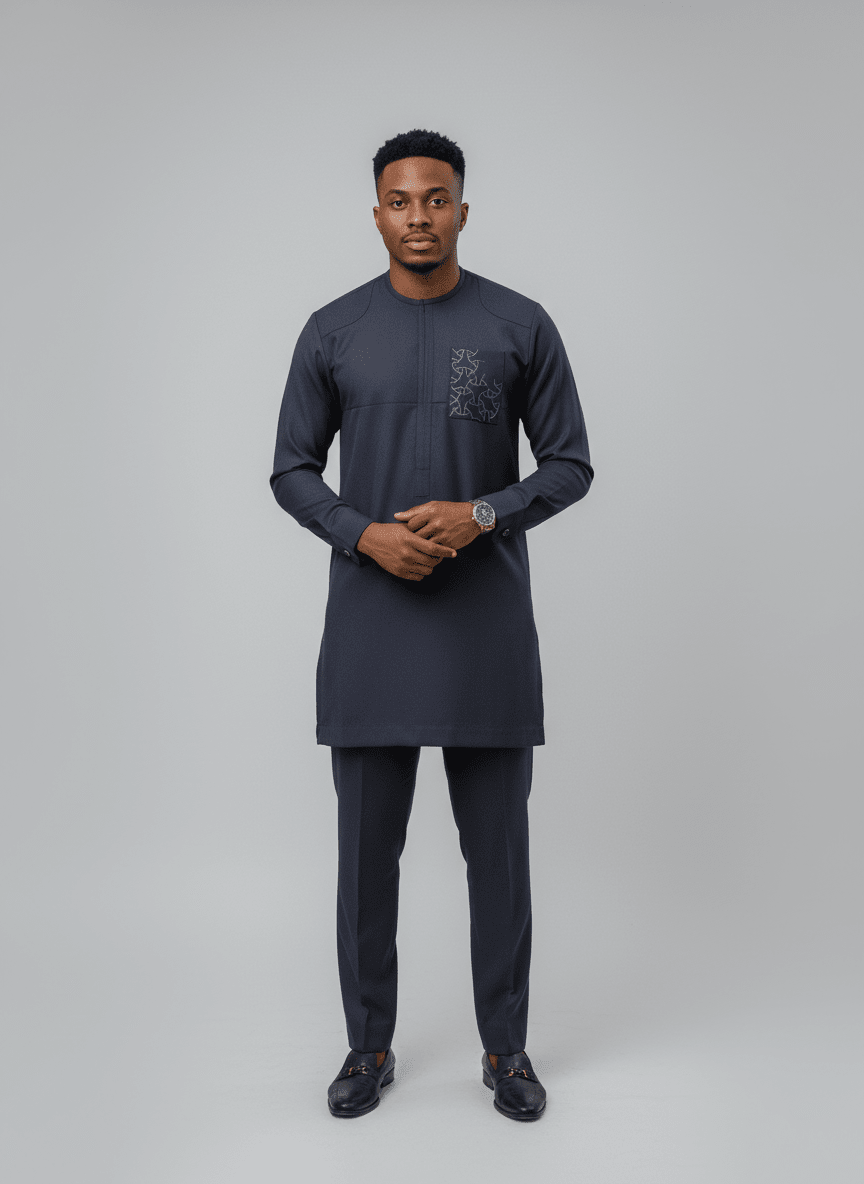 Chez Ibag Couture, chaque création est une célébration de l'élégance et de l'artisanat d'exception. L'Ensemble Nuit Onyx incarne cette philosophie, offrant à l'homme moderne une tenue à la fois raffinée et profondément ancrée dans l'héritage textile africain. Conçu pour les moments les plus prestigieux, cet ensemble prêt-à-porter fusionne avec maestria le style contemporain et une sophistication intemporelle. La tunique et son pantalon assorti se déclinent dans un bleu nuit profond, une teinte qui évoque la noblesse et le mystère, parfaitement adaptée aux cérémonies et événements de haute importance. La matière, un tissu fluide et lisse de qualité supérieure, caresse la peau et assure un drapé impeccable, garantissant un confort absolu et une allure distinguée tout au long de la journée ou de la soirée. Chaque détail a été pensé avec minutie. Le col mao, emblématique d'une élégance discrète, confère une ligne épurée et moderne. Des empiècements structurés aux épaules soulignent la silhouette masculine avec prestance. L'apothéose du savoir-faire Ibag Couture se révèle dans la broderie. Sur la poche poitrine gauche, une broderie géométrique, stylisée et discrète, est réalisée à la main par nos artisans experts. Ce motif subtil n'est pas qu'un simple ornement, c'est une signature, un témoignage du temps et de la dextérité consacrés à chaque point, transformant ce vêtement en une œuvre d'art portable. L'Ensemble Nuit Onyx est plus qu'un vêtement ; c'est une expérience de luxe, une affirmation de goût. Il promet non seulement une allure irréprochable mais aussi la sensation unique de porter une pièce imprégnée de notre dévotion à l'artisanat d'excellence et à l'esprit du sur-mesure. Une invitation à briller avec distinction.