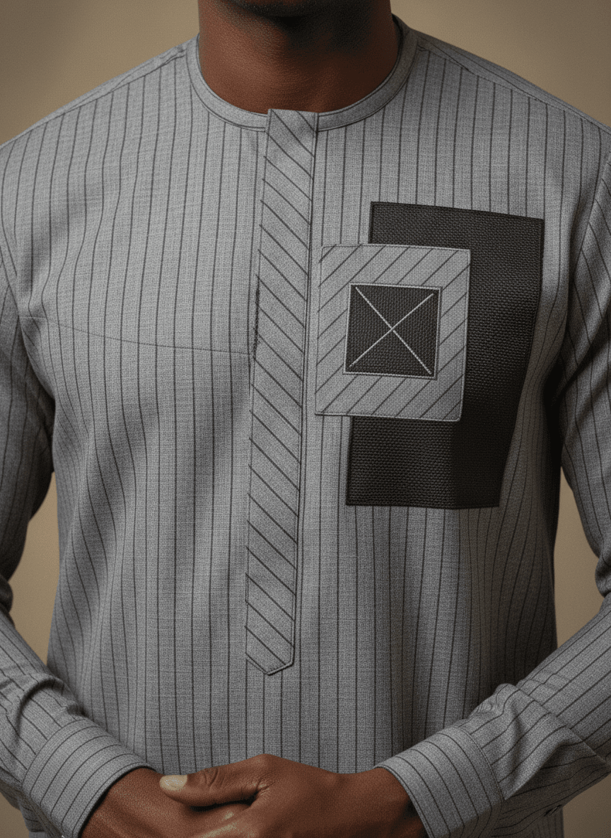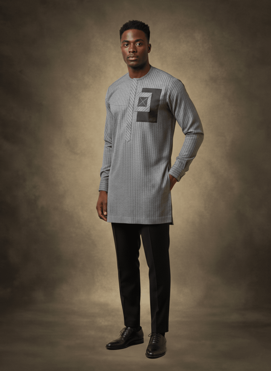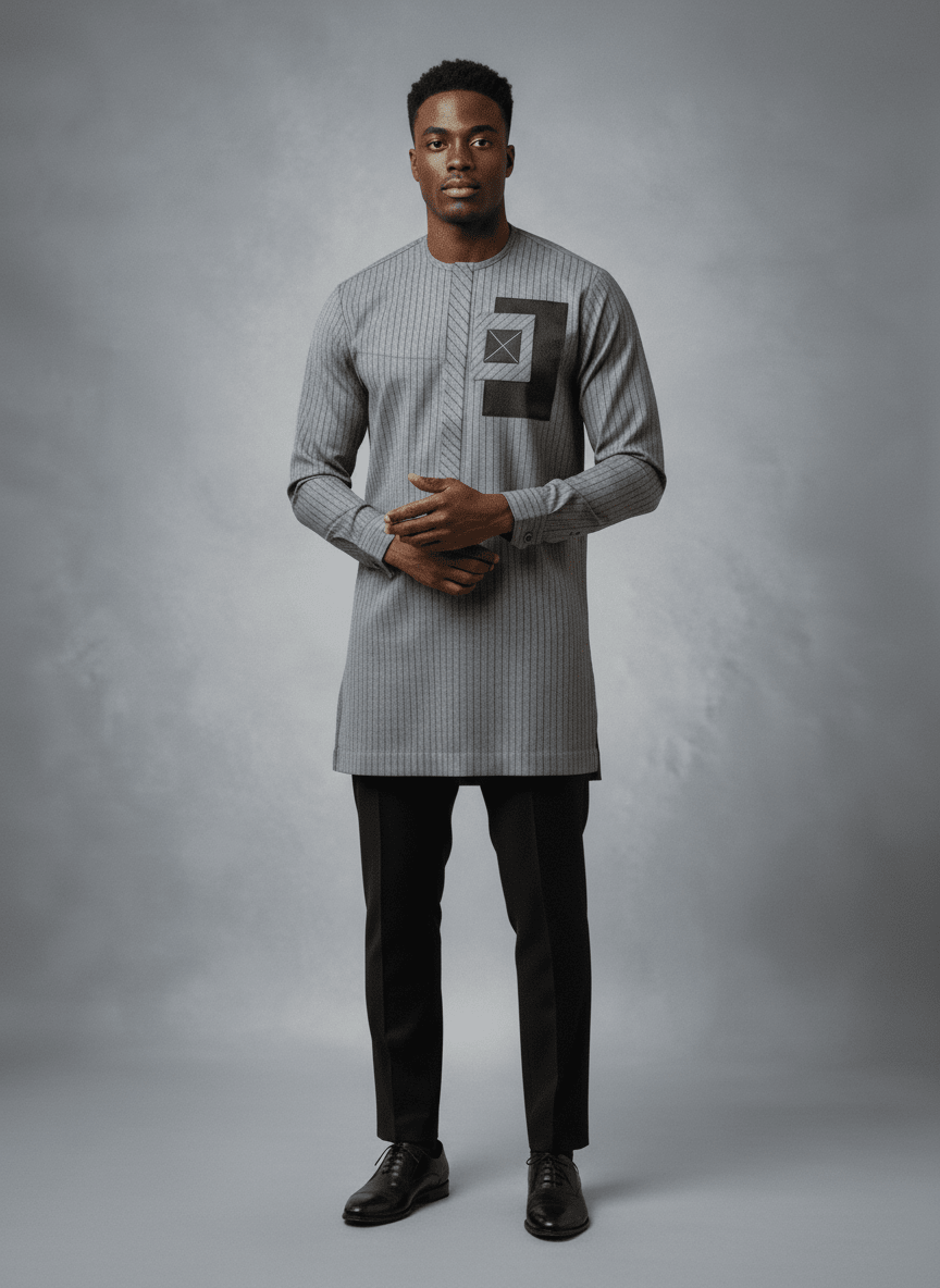 Chez Ibag Couture, nous sculptons l'identité masculine avec une authenticité et une audace renouvelées. L'ensemble « L'Ascension Urbaine » incarne cette vision, proposant une réinterprétation moderne du vestiaire masculin pour l'homme contemporain. Pensé pour conjuguer élégance décontractée et raffinement, cet ensemble en coton, choisi pour sa souplesse et sa respirabilité, offre un confort absolu sans jamais transiger sur le style. Le haut se distingue par une teinte grise subtile, animée par de fines rayures verticales qui allongent la silhouette avec discrétion. Son empiècement rectangulaire sombre, délicatement posé sur la poitrine gauche, est orné d'un motif géométrique en X clair, signature de notre atelier. Ce détail, exécuté avec une précision artisanale, révèle une fusion harmonieuse entre tradition africaine et esthétique avant-gardiste. Le col rond épuré et les fentes latérales innovantes parachèvent une coupe moderne et aérienne, offrant une liberté de mouvement et une allure résolument chic. Chaque couture, chaque finition témoigne du savoir-faire exceptionnel d'Ibag Couture, où l'artisanat textile est élevé au rang d'art. Que ce soit pour une occasion professionnelle décontractée ou une soirée élégante, « L'Ascension Urbaine » est plus qu'un vêtement ; c'est une affirmation de soi, un reflet de votre goût pour l'excellence et l'exclusivité. Un chef-d'œuvre prêt-à-porter qui porte en lui l'âme du sur-mesure.