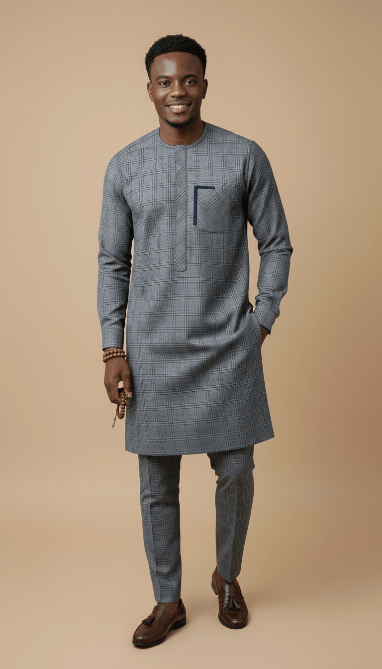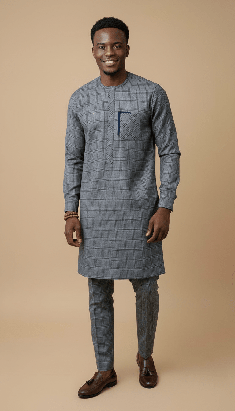 L'Ensemble Urbain Héritage d'Ibag Couture incarne la fusion parfaite entre tradition revisitée et modernité audacieuse. Conçu pour l'homme contemporain qui apprécie l'élégance décontractée et le confort absolu, cet ensemble prêt-à-porter est le fruit d'un savoir-faire artisanal exceptionnel, signature de notre maison. Il se compose d'une tunique à manches longues et d'un pantalon assorti, tous deux taillés dans un sublime textile à carreaux gris, sélectionné pour sa texture raffinée et son tombé impeccable. La tunique, pièce maîtresse de cet ensemble, arbore un col rond épuré et une courte patte de boutonnage, gage de discrétion et de sophistication. Le détail qui fait toute la différence réside dans sa poche poitrine carrée, subtilement agrémentée d'un motif géométrique bleu marine. Ce contraste délicat témoigne de notre attention aux finitions et de notre maîtrise des techniques textiles. Le pantalon, pensé pour compléter la tunique avec harmonie, offre une coupe confortable et moderne, assurant une silhouette équilibrée et distinguée. Que ce soit pour une occasion spéciale ou un quotidien raffiné, L'Ensemble Urbain Héritage vous enveloppe d'une aura de prestance et d'aisance, reflétant l'excellence de la couture africaine haut de gamme. Chaque couture, chaque motif est une ode à l'artisanat, conçu pour un homme dont l'allure est une déclaration.