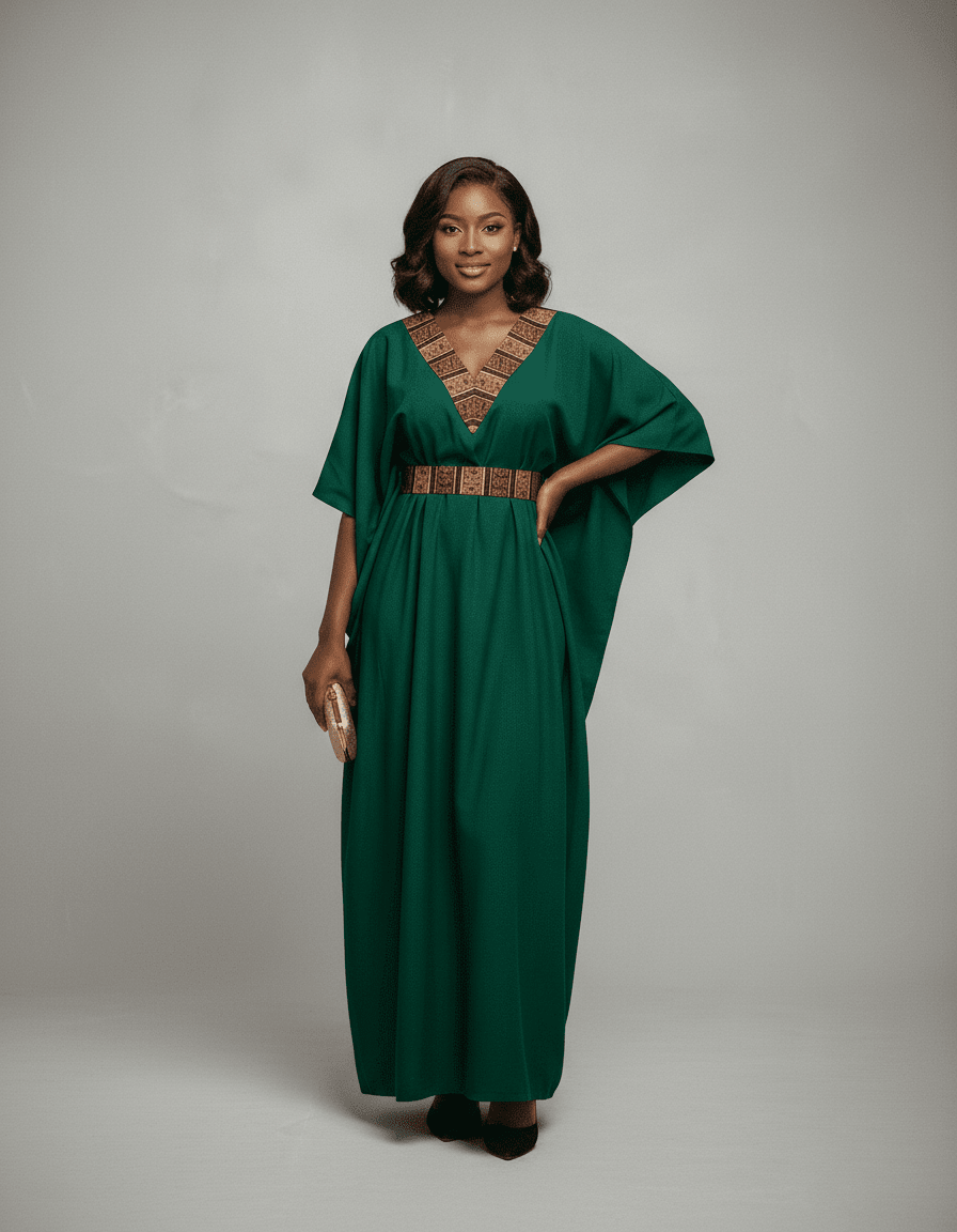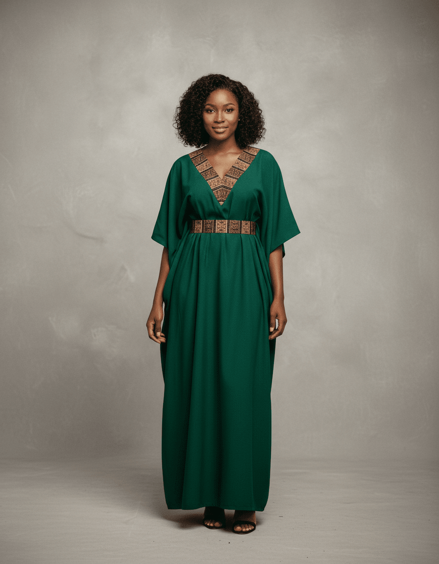 Chez Ibag Couture, chaque pièce est une célébration de l'élégance et de l'héritage africain. Le Caftan Lumière Émeraude, issu de notre collection prêt-à-porter, incarne cette philosophie avec une grâce inégalée. Confectionné dans un crêpe d'une fluidité exquise, il enveloppe la silhouette avec un confort absolu et un tombé impeccable, caractéristique de notre exigence en matière de qualité et de notre savoir-faire traditionnel. La sélection rigoureuse de ce tissu garantit une sensation de légèreté et une tenue parfaite, témoignant de l'attention portée aux moindres détails. La couleur vert émeraude, riche et profonde, évoque la splendeur des paysages africains, offrant une toile de fond somptueuse aux détails qui font la singularité de cette création. L'encolure en V est magnifiée par une large bande ornée de motifs géométriques africains, délicatement exécutés dans des nuances dorées et marron. Ces ornements ne sont pas de simples décorations ; ils sont le fruit d'un travail artisanal méticuleux, où chaque ligne et chaque couleur sont appliquées avec une précision héritée de générations d'artisans textiles, rendant hommage à la richesse de notre culture. Cintré à la taille par une ceinture assortie, le caftan sculpte élégamment la silhouette tout en préservant une liberté de mouvement et un confort essentiels, fusion parfaite entre modernité chic et touches ancestrales. Idéal pour les événements distingués ou pour sublimer le quotidien d'une élégance raffinée, le Caftan Lumière Émeraude est une invitation à porter une œuvre d'art, un pont entre tradition et contemporanéité, façonné avec passion et respect des techniques artisanales les plus fines qui font la renommée d'Ibag Couture.