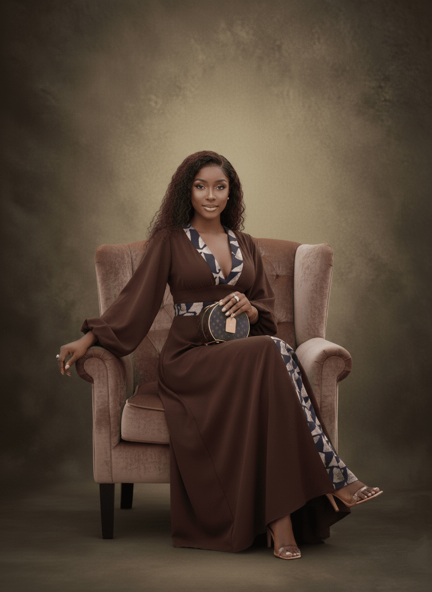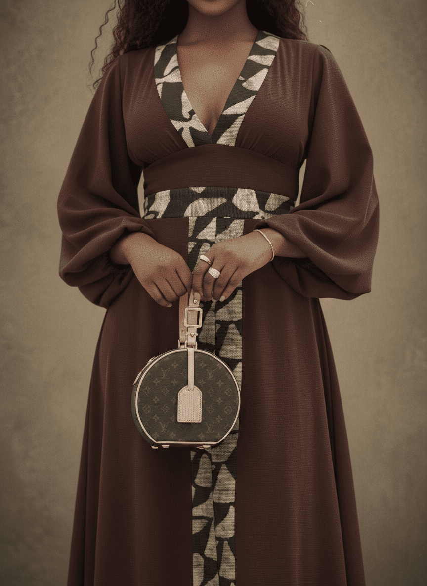 Découvrez la Robe Harmonie Géométrique, une pièce maîtresse de notre collection prêt-à-porter Ibag Couture, où l'élégance moderne rencontre la richesse de l'artisanat africain. Confectionnée dans un crêpe d'un brun foncé profond, cette robe longue incarne une sophistication intemporelle, idéale pour la femme qui cherche à affirmer son style avec distinction. Son décolleté en V plongeant, subtilement audacieux, allonge la silhouette tandis que les manches amples ajoutent une touche de fluidité et de grâce à chaque mouvement. Le véritable cœur de cette création réside dans l'intégration magistrale d'une bande de tissu à motifs géométriques contrastants. Minutieusement appliquée sur le buste et descendant verticalement sur le devant, cette bande est le fruit d'un savoir-faire artisanal exceptionnel, reflétant la précision et la passion de nos ateliers. Chaque motif est choisi pour compléter la profondeur du crêpe, créant un dialogue visuel captivant. Au-delà de son esthétique raffinée, la Robe Harmonie Géométrique a été pensée pour le confort suprême. Le drapé impeccable du crêpe assure une sensation de légèreté et une liberté de mouvement, tandis que sa coupe impeccable flatte toutes les morphologies. C'est une invitation à porter une œuvre d'art, une expression de l'identité Ibag Couture où chaque détail raconte une histoire d'excellence et d'authenticité. Elle se destine à celles qui apprécient l'alliance parfaite entre le luxe contemporain et l'héritage textile africain, pour des occasions où l'élégance est de mise.